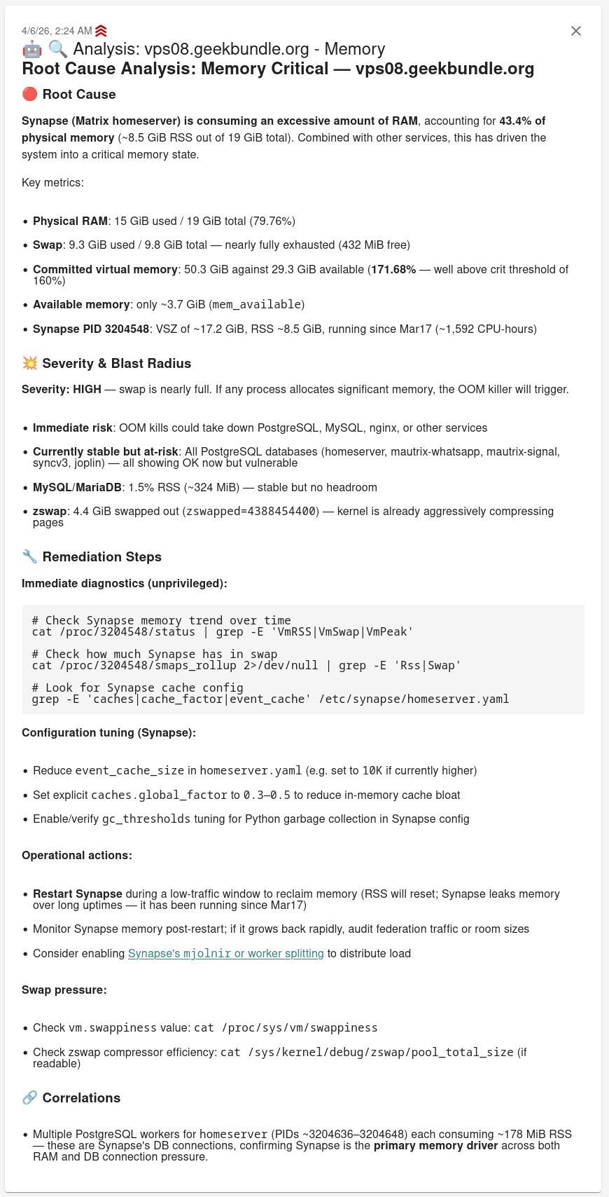 Monitoring-Alerts sind großartig. Man wird benachrichtigt, dass etwas nicht stimmt. Aber dann sitzt man da, liest "KubePodCrashLooping" oder "CRIT - CPU load" und fängt an, manuell Logs zu wühlen, Metriken zu checken und kubectl-Befehle zu tippen.